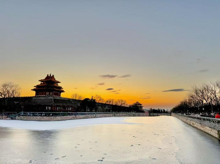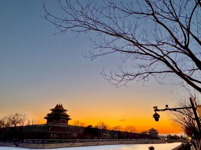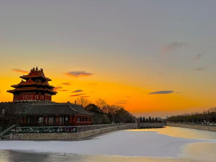 12月16日傍晚,刚经历过降雪的北京碧空如洗,故宫角楼的琉璃瓦覆盖着薄雪,在暖橙与绯红交织的晚霞中熠熠生辉。