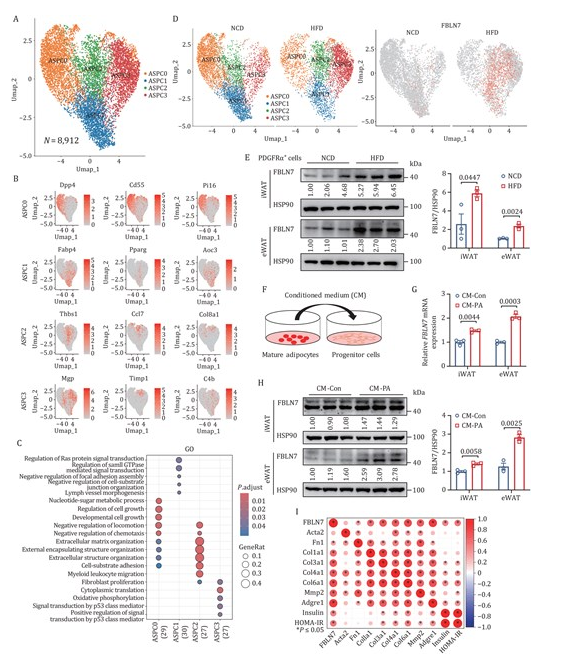 单细胞RNA测序揭示,肥胖小鼠脂肪组织中PDGFRα+脂肪干细胞前体细胞(ASPCs)内的FBLN7表达上调