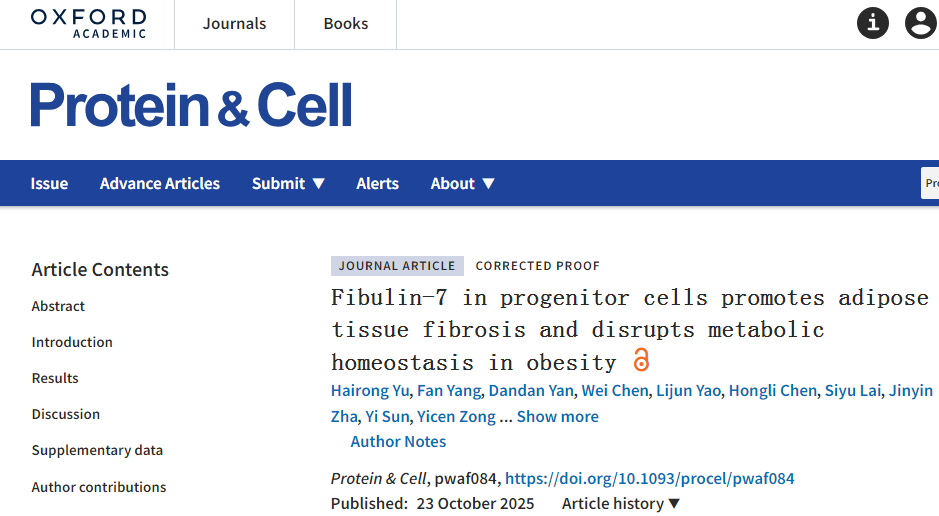 Hairong Yu, Fan Yang, Dandan Yan, et al. Fibulin-7 in progenitor cells promotes adipose tissue fibrosis and disrupts metabolic homeostasis in obesity. Protein & Cell,2025. DOI:10.1093/procel/pwaf084.