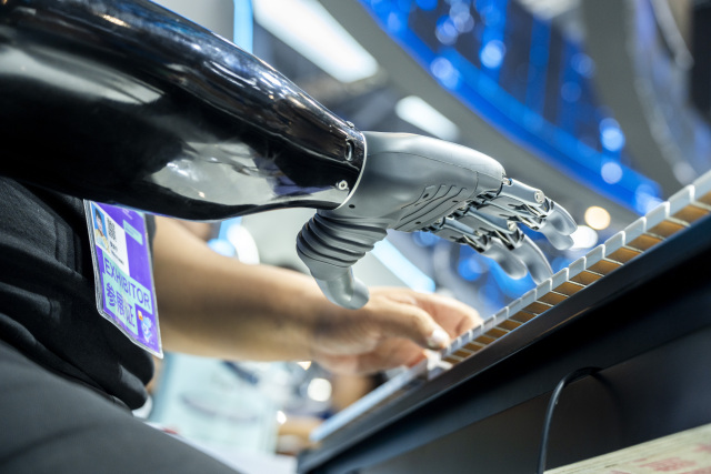 在仿生手的帮助下,强脑科技的工作人员用意念弹奏钢琴。