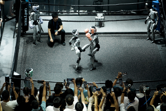 第四届全球数字贸易博览会上,宇树科技的人形机器人在擂台上“格斗”。