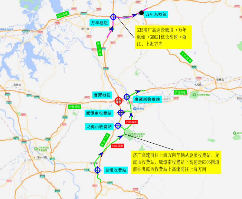 线路二: G35济广高速→金溪收费站、龙虎山收费站、鹰潭南收费站下高速→G206国道→鹰潭西收费站上高速→浙江、上海方向。