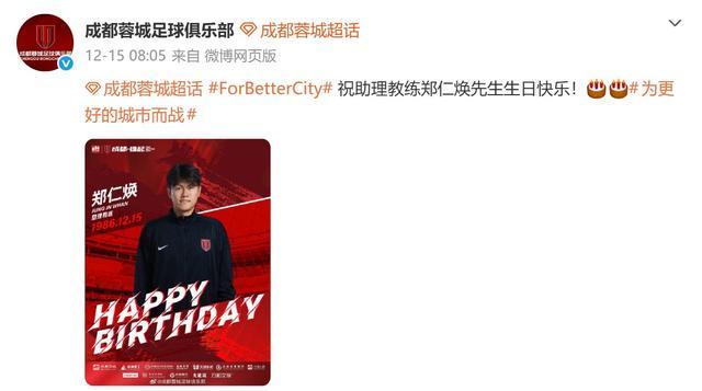昨天是徐正源的55岁生日,成都蓉城官方并在社交媒体为主帅送上祝福,而此前在15日,成都蓉城官方曾为助教郑仁焕送上生日祝福。