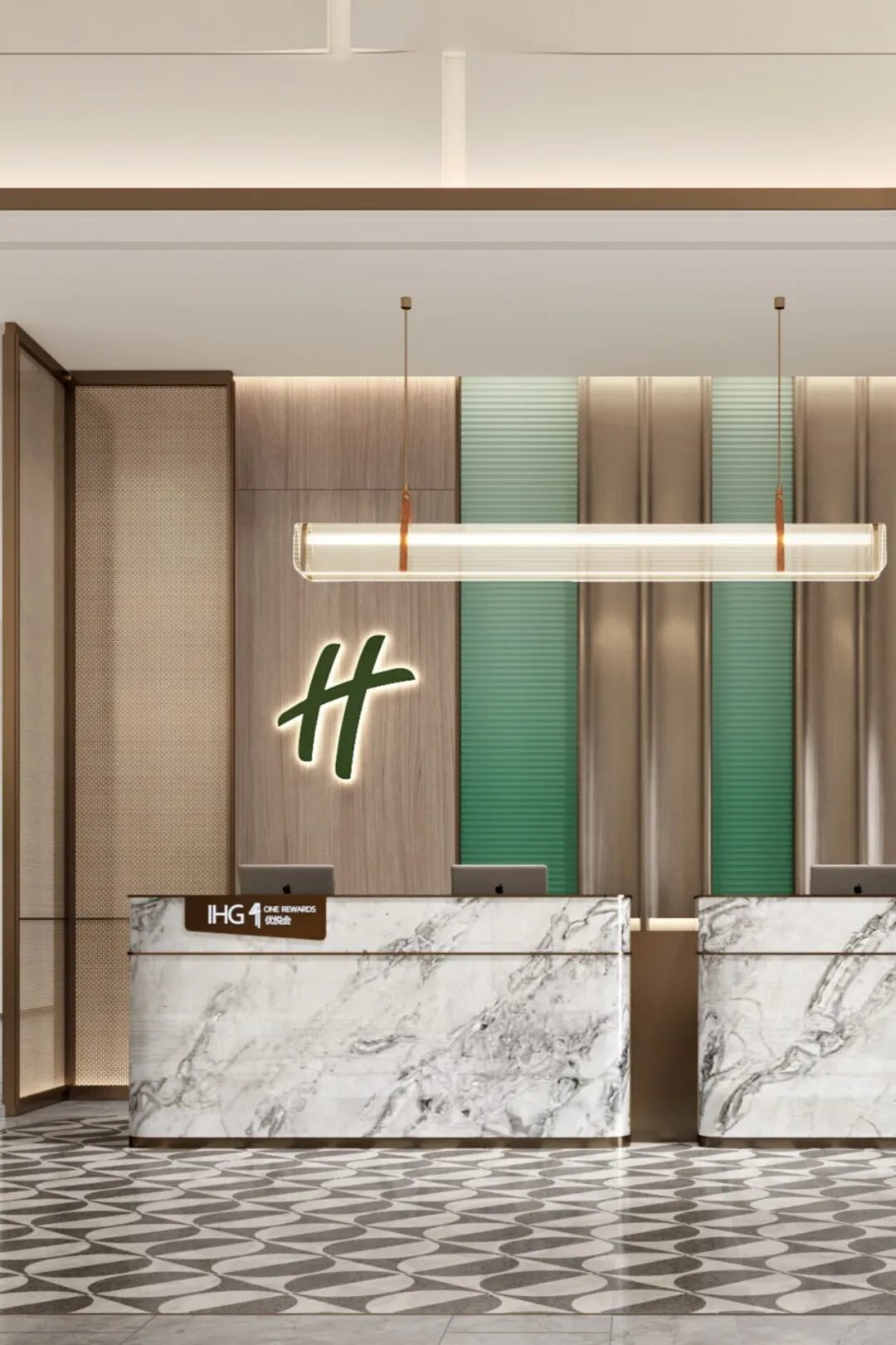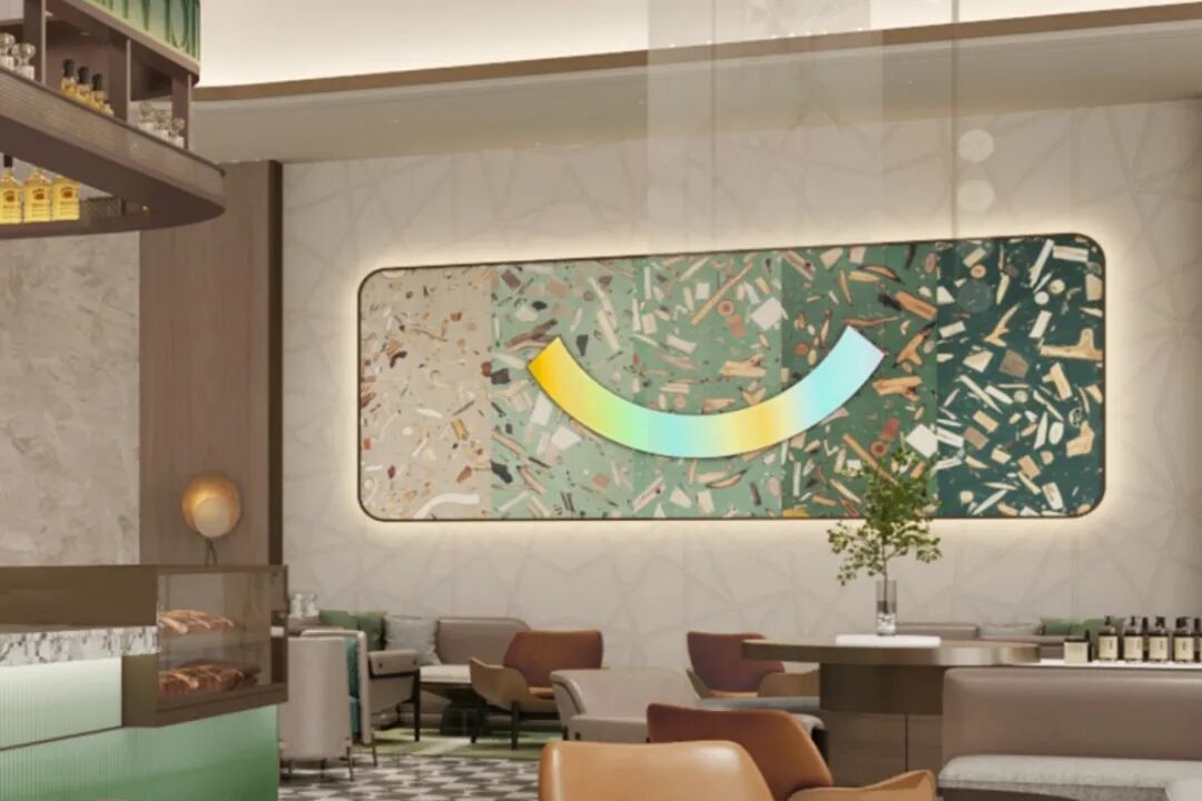 假日酒店3.0点亮版设计 以“连接”为内核,呈现更具仪式感、更富社交性、更高品质的假日体验。大堂的微笑墙作为3.0设计的重要元素,采用可回收环保材料制作,传递品牌对地球未来的考量。此外,微笑元素也通过电子屏一类现代科技载体,以动态醒目的方式展示;还可结合属地特色进行个性化的创意设计,增加新意也强化品牌辨识度。