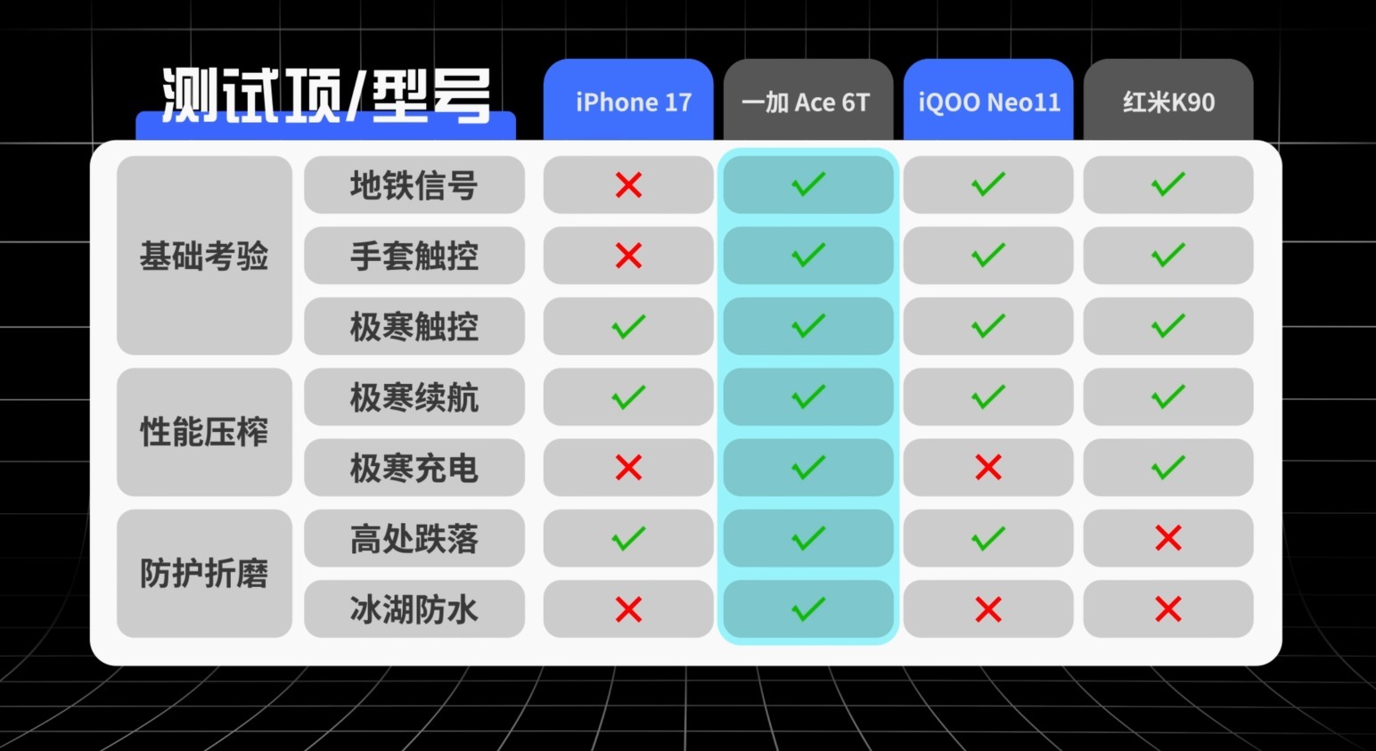 基础实用性作为手机的核心竞争力,是用户在极端环境下的“生命线”。从本次测试来看,一加 Ace 6T凭借均衡稳定的信号表现和精准灵敏的触控响应,成为基础实用性的佼佼者;iQOO Neo11与红米K90表现合格,能满足多数用户的日常需求;而 iPhone 17则在触控适配性上仍有较大的提升空间。