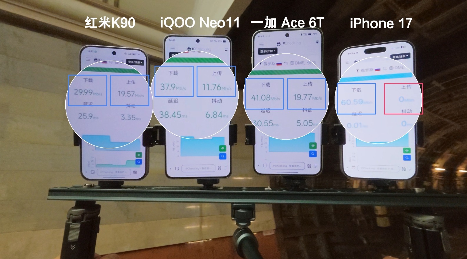 测试结果显示,四款机型均完成了基本通信任务,但表现各有区别。iPhone 17延续了其在下载速率上的传统优势,峰值表现亮眼,但上传速率出现明显异常,稳定性不足;一加 Ace 6T则展现出均衡实力,上下行速率的成绩均属优秀水平;iQOO Neo11与红米K90紧随其后,整体表现与一加差距不大,虽峰值速率略低,但满足日常通信需求完全没问题。