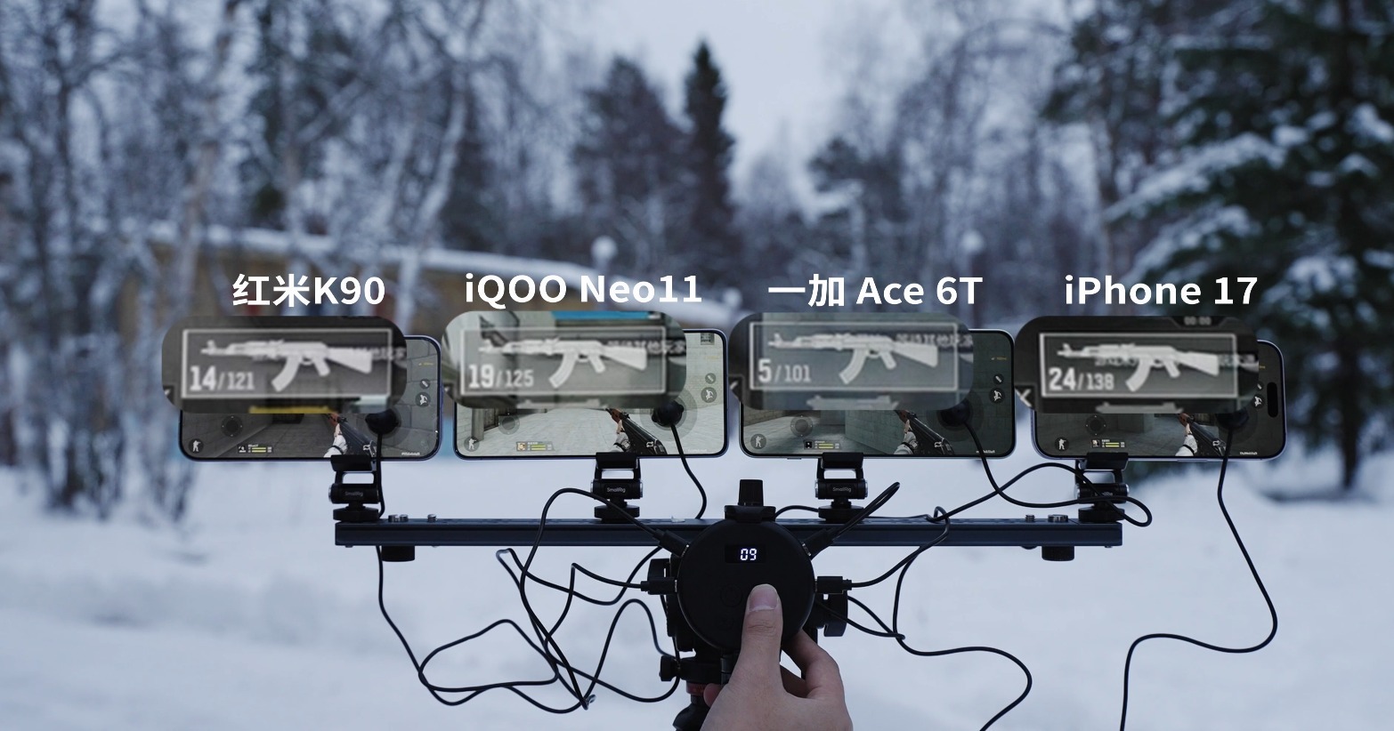 测试结果颇具戏剧性,一加 Ace 6T以显著优势领先,剩余弹药数量大幅少于其他三款机型,展现出极强的低温触控灵敏度;红米K90与 iQOO Neo11处于中游水平,触控延迟在可接受范围内;而iPhone 17则表现平平,剩余子弹数最多,触控响应的迟钝感明显。