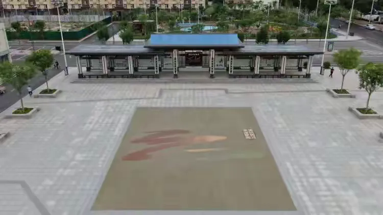 广场总体布局为“一轴四区”:“一轴”由北到南,依次为北入口、黄河水系缩影、“九曲黄河”铺装、黄河文化长廊。“四区”为入口形象区、集会活动区、休闲纳凉区和文化展示区。中间设有“九曲黄河”LOGO特色铺装,以浅灰色洗米石作图案背景,橙色到绿色渐变色洗米石做图案填充。