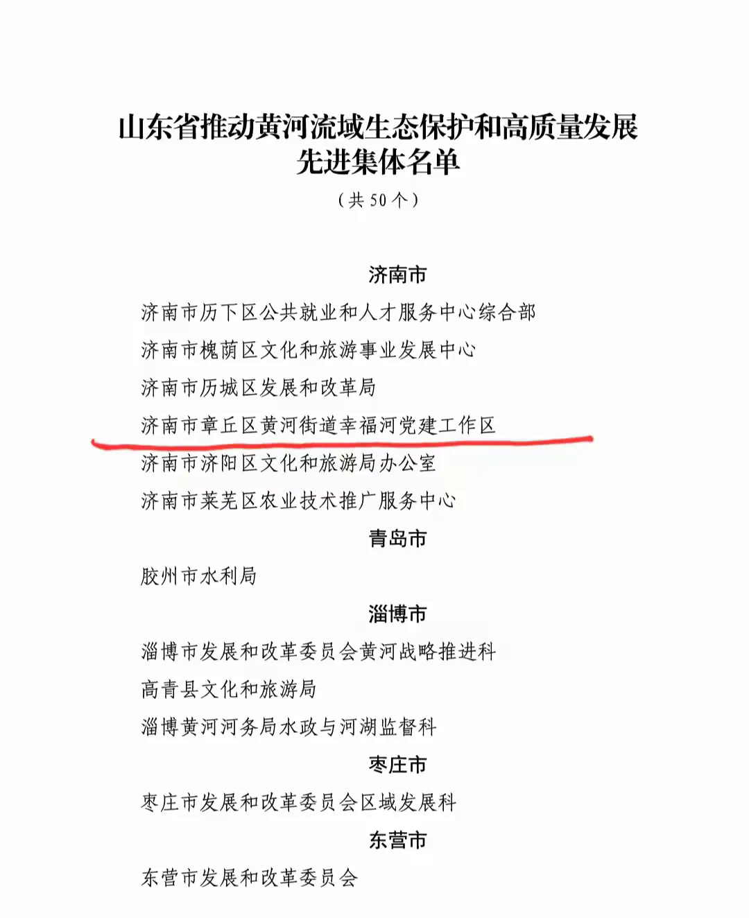近日,在山东省发展和改革委员会发布的《山东省推动黄河流域生态保护和高质量发展优秀范例和先进典型》中,黄河街道幸福河党建工作区荣获“山东省推动黄河流域生态保护和高质量发展先进集体”称号。