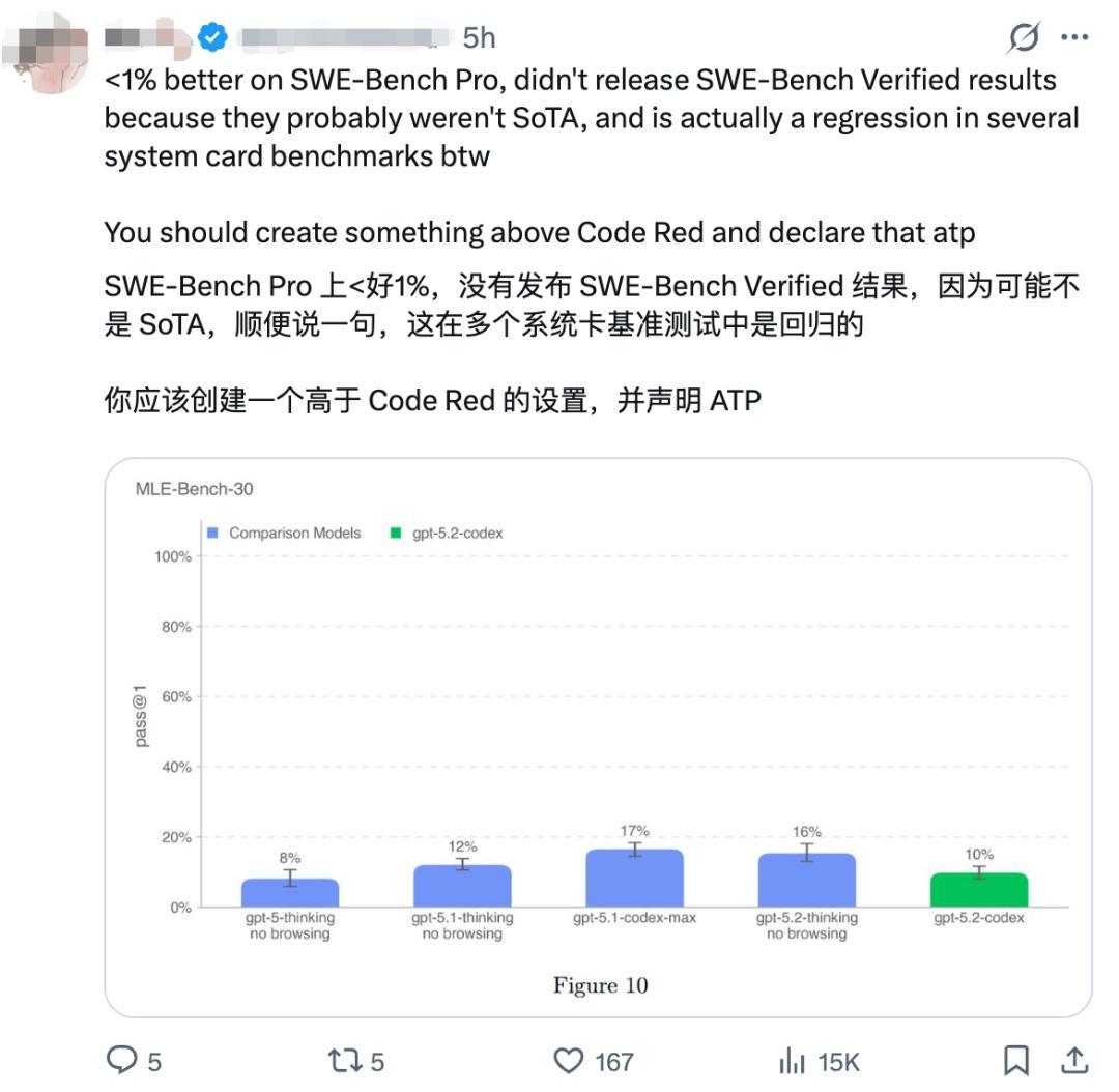GPT‑5.2-Codex的性能可能不及预期。有网友称,GPT‑5.2-Codex在SWE-Bench Pro上性能提升不到1%,还没有发布SWE-Bench Verified结果,这不免让人推测GPT‑5.2-Codex并未达当前最优水平,在一些系统卡基准测试中还出现了性能退步。