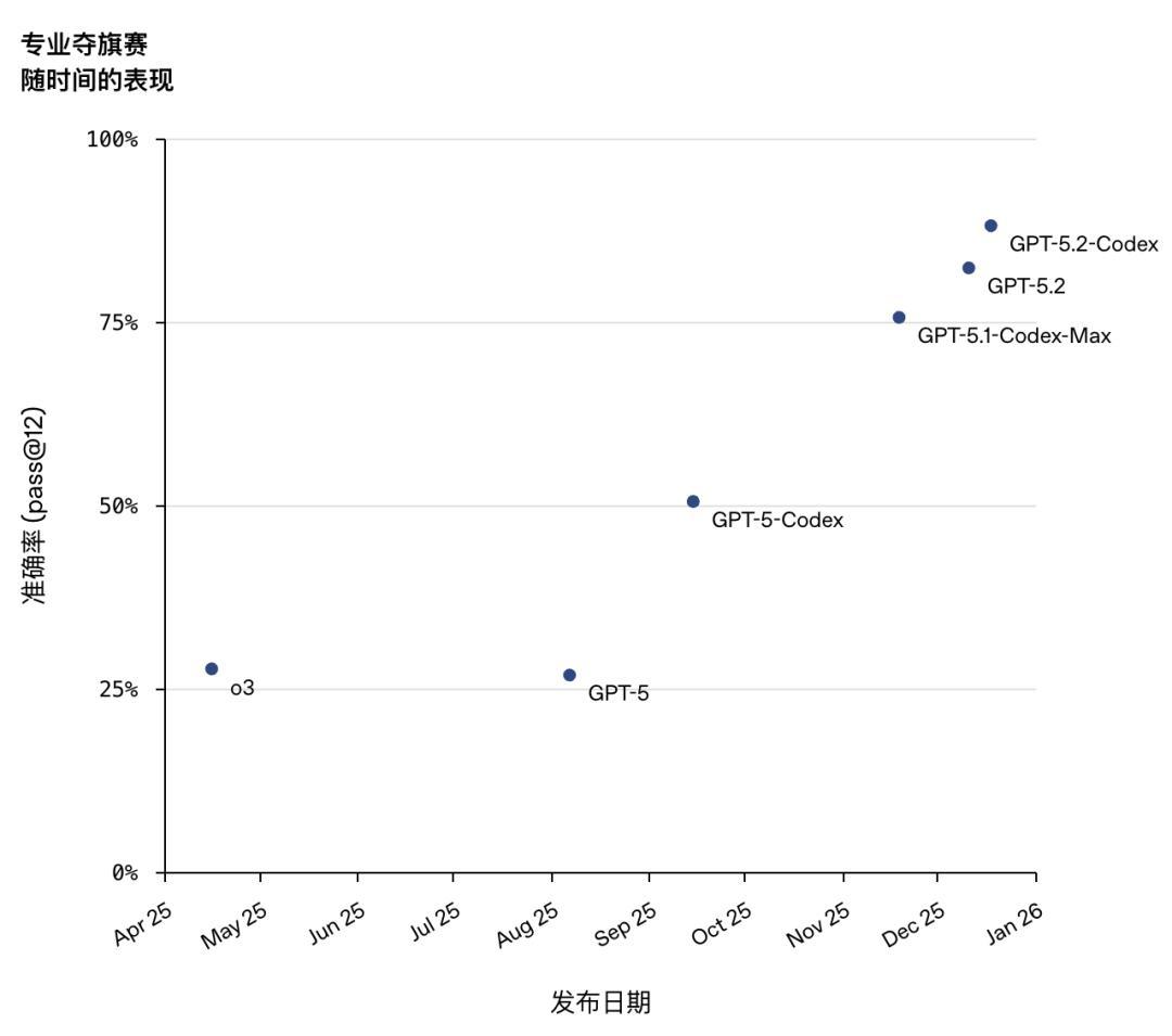据OpenAI官方博客,在网络安全领域,GPT‑5.2-Codex在夺旗挑战(CTF)中创下所有模型的最佳纪录。从折线轨迹来看,我们也能得出,就网络安全评估,OpenAI的模型能力正在持续提升。OpenAI博客称,他们正在全面升级网络安全防护,还引入可信访问机制来支持防御工作。