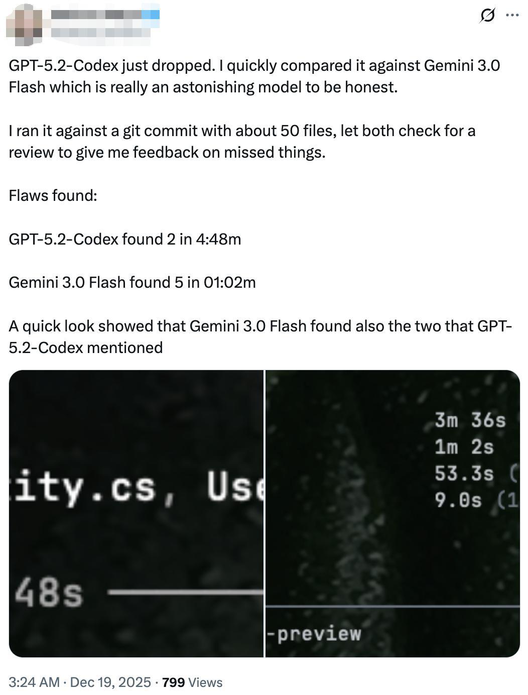 值得一提的是,GPT‑5.2-Codex发布之前,谷歌刚宣布推出Gemini 3 Flash模型。有网友让GPT‑5.2-Codex的Gemini 3 Flash共同执行任务,结果,GPT‑5.2-Codex败下阵来,在对50个文件进行漏洞审查的任务中,Gemini 3 Flash用时1分2秒,发现了5个问题,而GPT-5.2-Codex用时4分48秒,仅发现了2个Gemini 3 Flash已找到的问题。