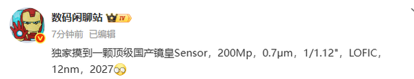 12月19日,博主“数码闲聊站”发文称,已了解到一款尚未公开的顶级国产图像传感器。