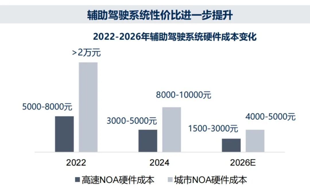 其中,在算力芯片领域,以地平线为代表的国产车规级芯片,正通过软硬件协同优化,将一套高阶智能驾驶系统(ADAS)的综合成本降低35%以上。在关键传感器领域,激光雷达的规模化装车成为成本下降的直接推手,价格也从最初的七八万美元一路降至如今的200美元。