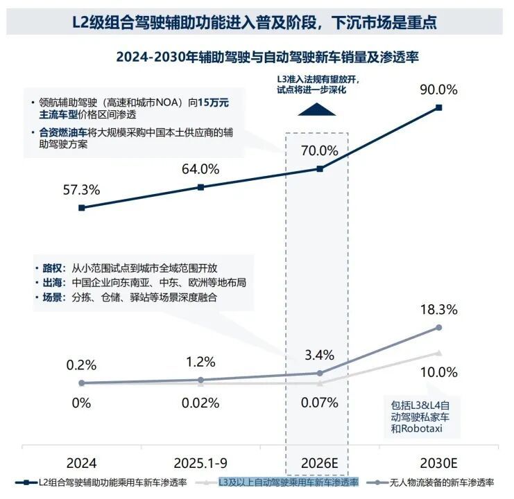 工信部最新数据显示,今年前三季度,具备组合驾驶辅助功能(L2级)的乘用车新车销量同比增长21.2%,市场渗透率已达64%。随着L3自动驾驶准入法规的逐步放开和试点的进一步深化,张永伟预判,2026年L2组合驾驶辅助功能乘用车新车渗透率将达到70%,L3及以上自动驾驶乘用车新车渗透率将实现突破,到2030年有望达到10%。