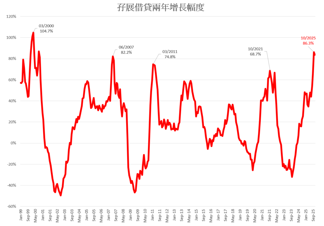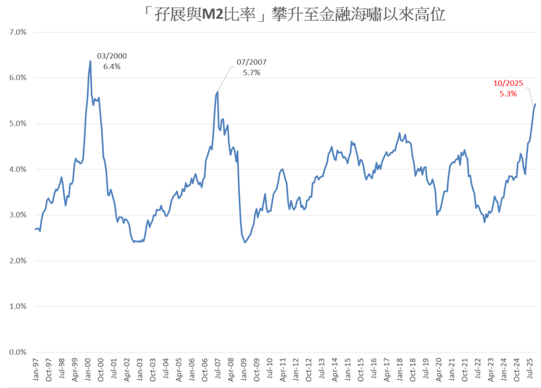 第三,自2008年金融海啸以来,联储局的货币政策,尤其是量化宽松(QE),对资产价格的影响举足轻重。然而,即使在货币供应持续扩张的背景下,若孖展借贷仍然出现显着且加速的上升,便意味股市的杠杆化程度正进一步恶化,泡沫特征亦更为明显。