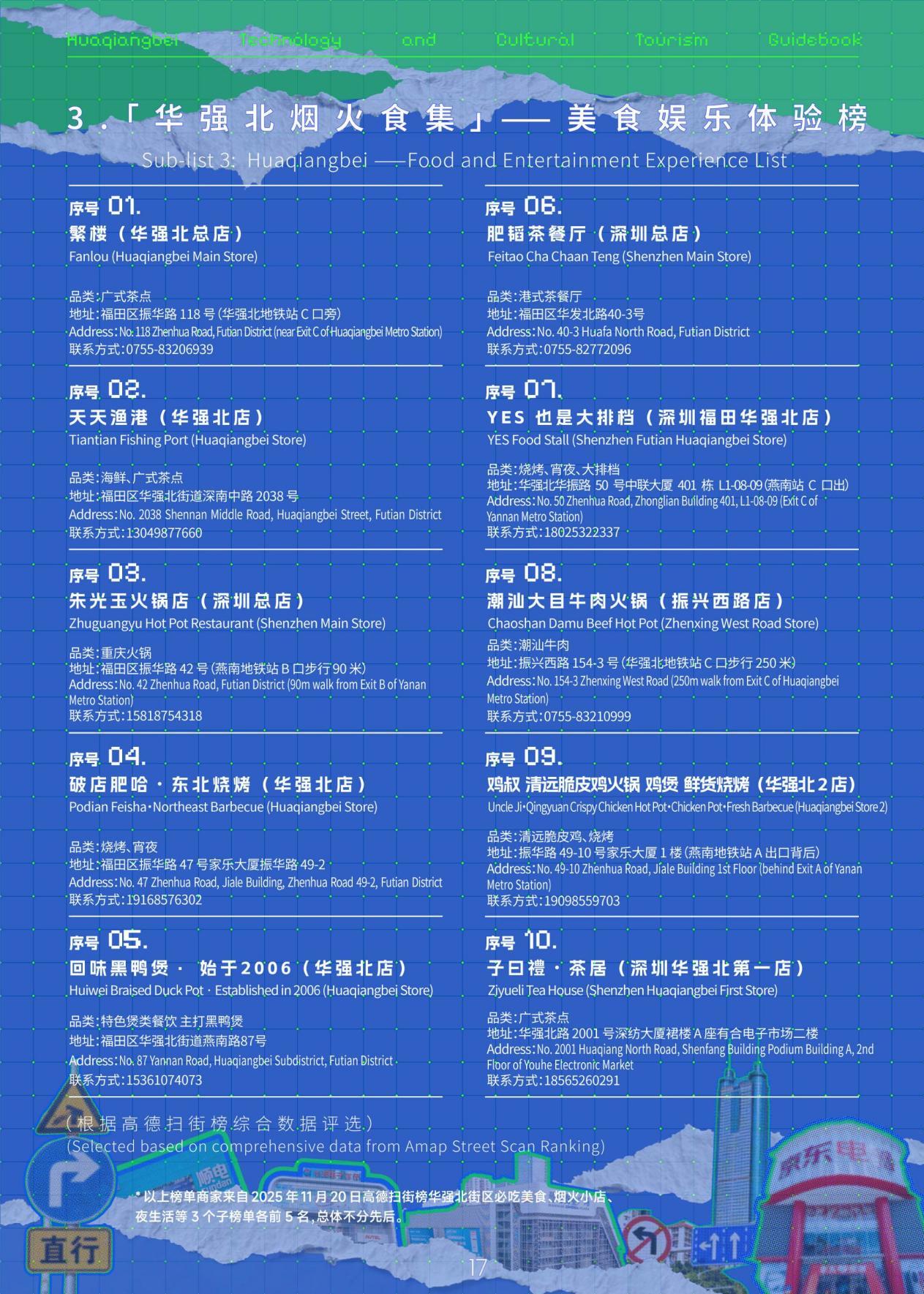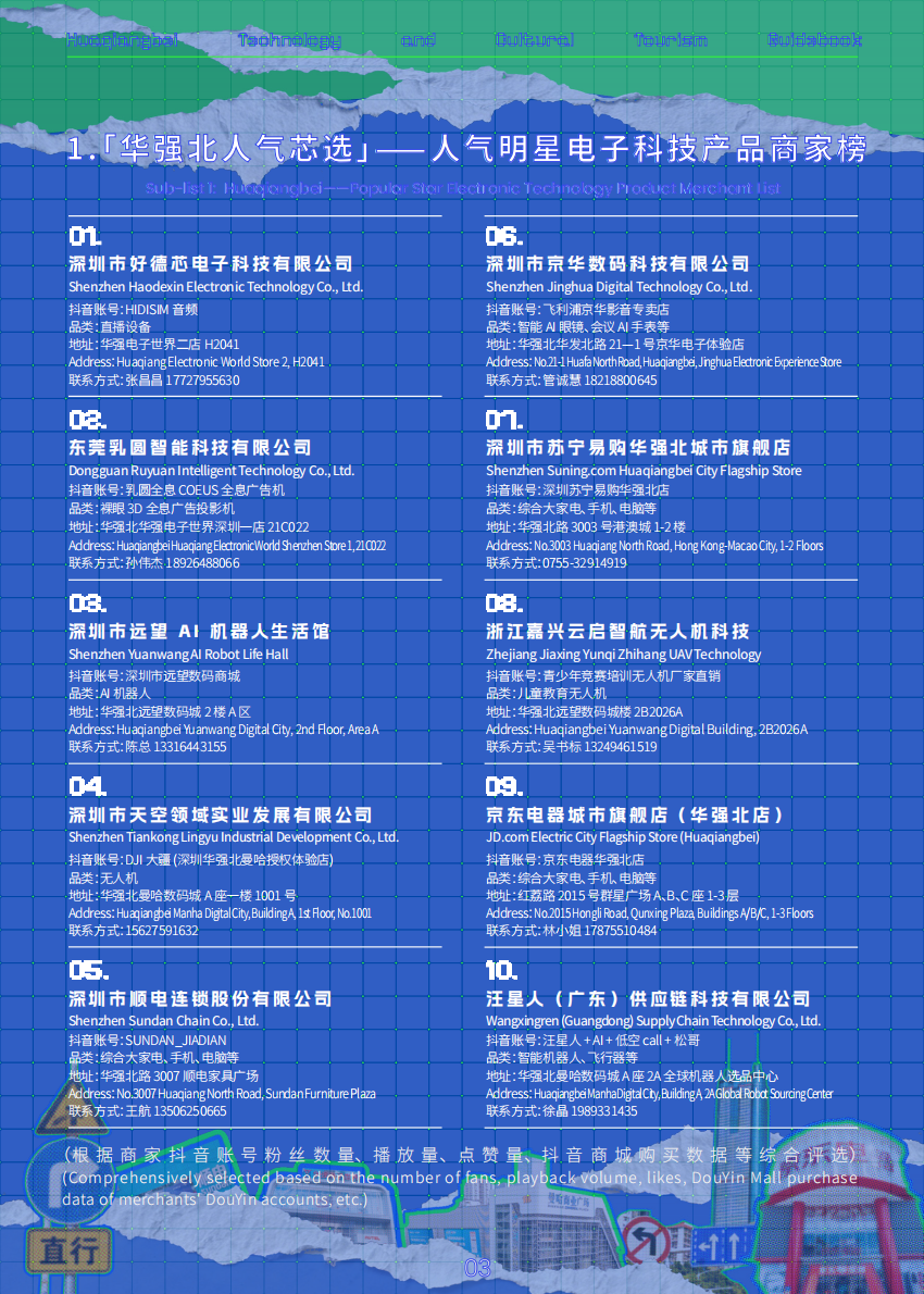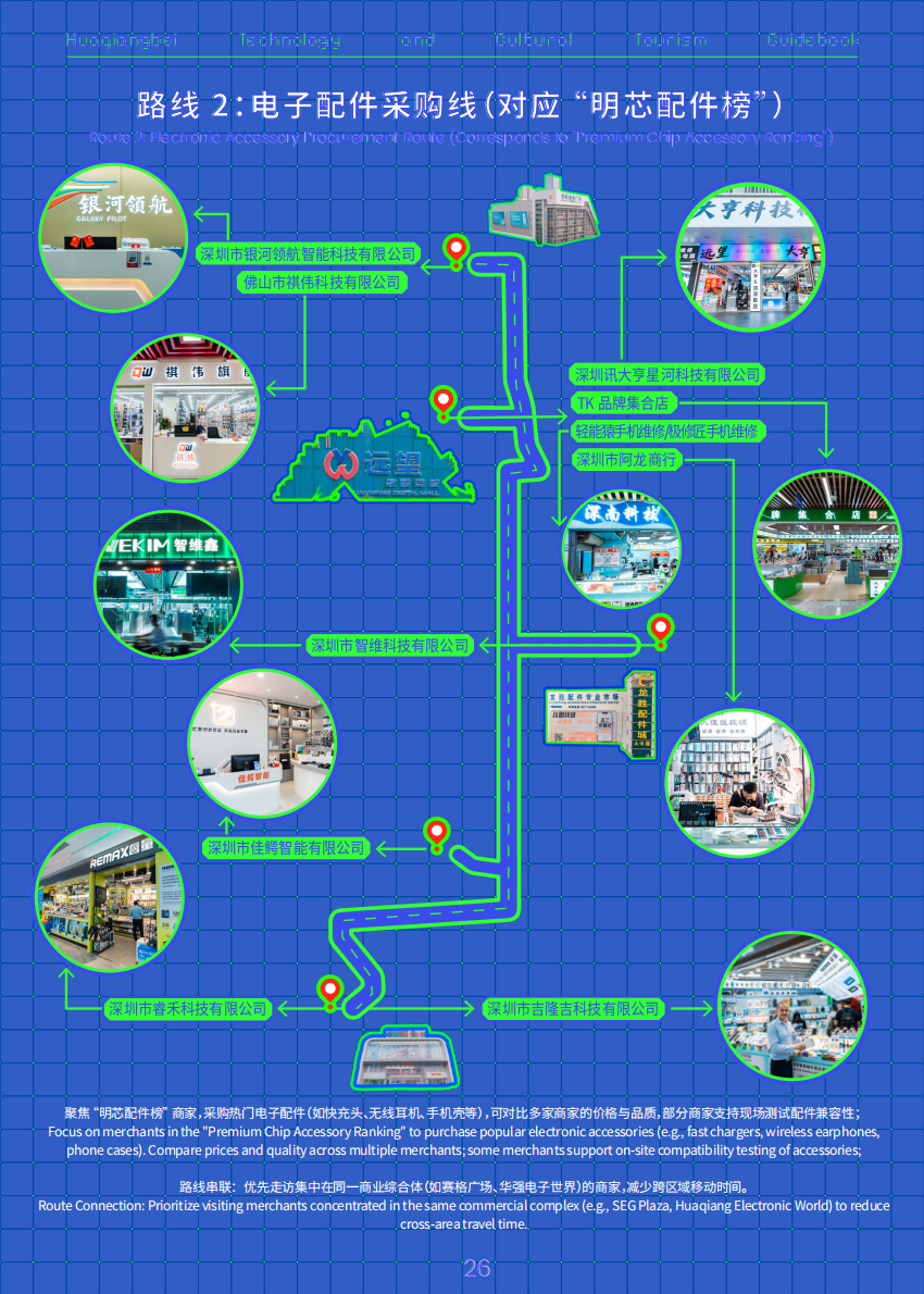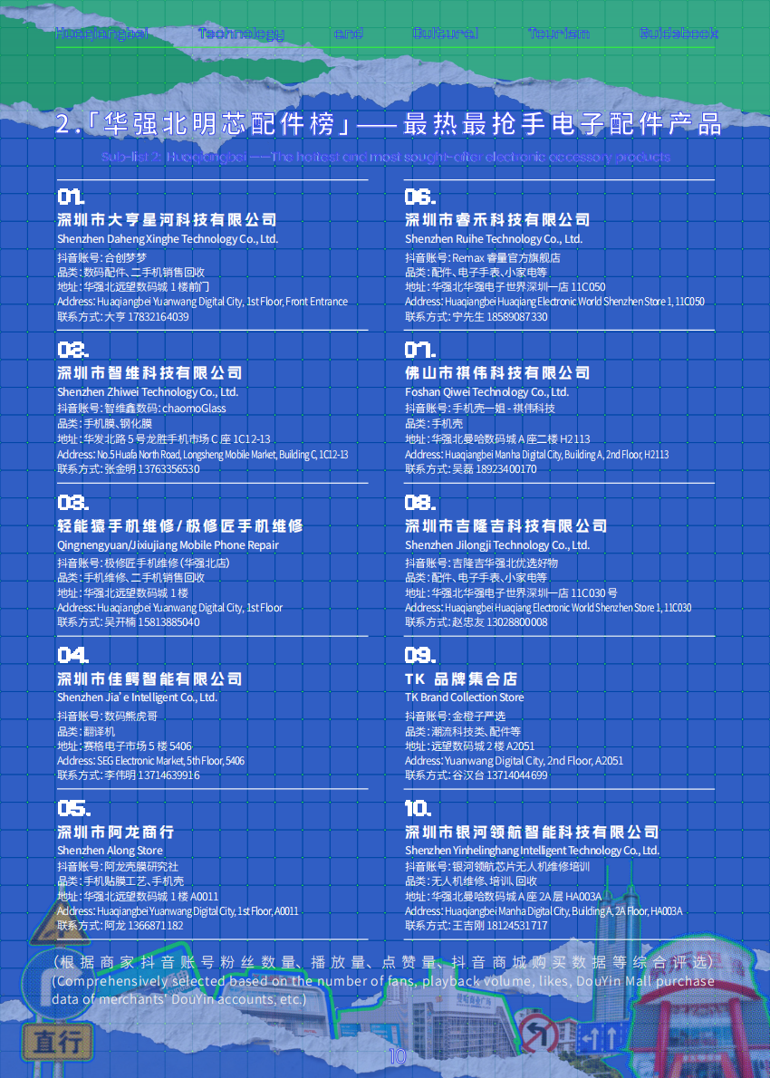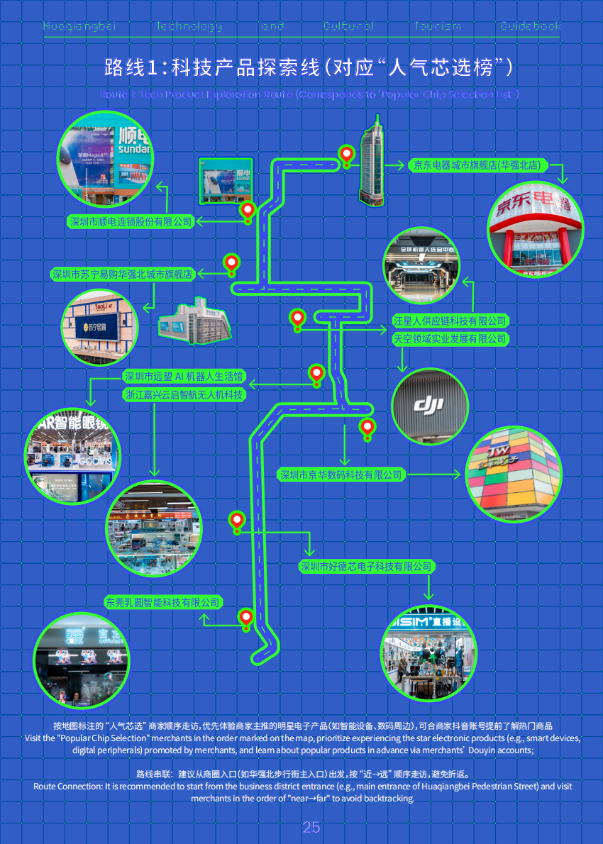 本次活动还基于“华强北科技文旅体验榜”的“华强北深度探索指南”,制作双语版《华强北科技文旅路书》,将上榜商户的地址、联系方式、销售内容一一呈现,并形成3条完全不同的打卡购买路线,专属导航路线直达核心点位,在华强北买买买再不怕迷路了!