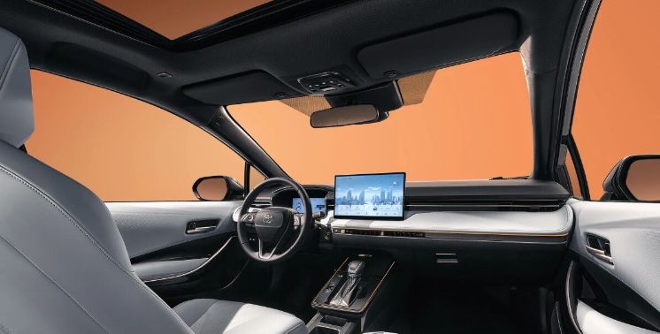 进入内饰,新款丰田雷凌基本延续了新款锋兰达的设计,整体中控造型更为简洁,大量取消了物理按键,配备8.8英寸的全液晶仪表和12.9英寸悬浮式中控屏,不过车机还搭载8155P车规级芯片,预计流畅性将有较大提升。