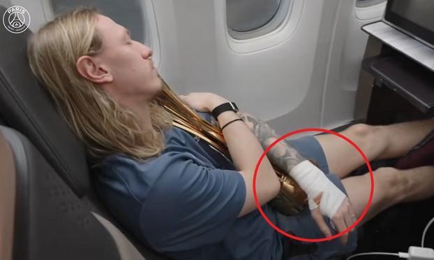 在巴黎圣日耳曼周五上午发布的洲际杯夺冠回顾视频中,这位多哈之夜的英雄在返程航班上怀抱奖杯,画面中可以清楚看到,他的左手和左前臂已缠上厚厚的绷带,而在更衣室内庆祝时,这一绷带尚未出现。