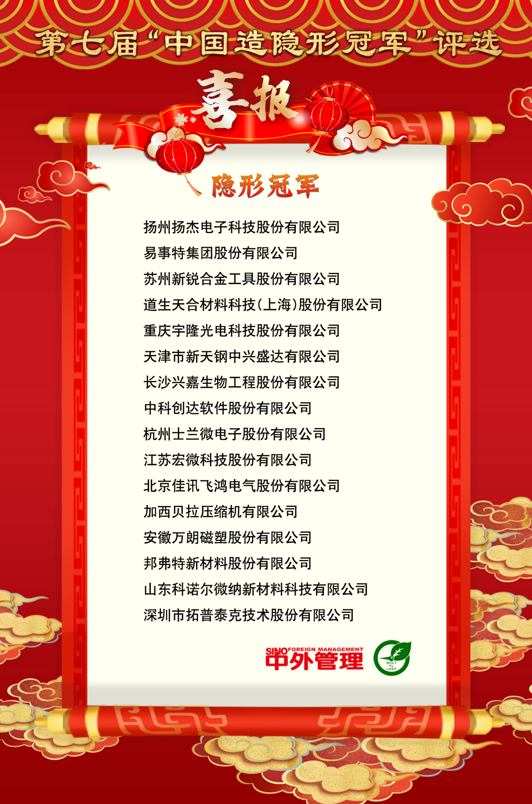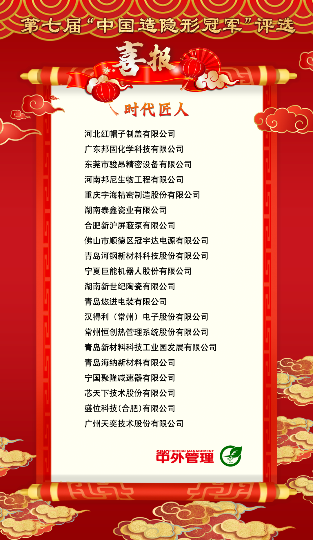 本届大会上,第七届“中国造隐形冠军”评选榜单在闪耀的聚光灯下隆重揭晓。此前,经过20位国内外顶级企业实战派专家、著名商学院院长、投资机构、媒体等多方严谨细致的评定,背对背、优选优的评审投票,16家“中国造隐形冠军”和20家“时代匠人”最终成功胜出,他们在各自领域内均展现出卓越实力与独特优势,堪称行业典范。