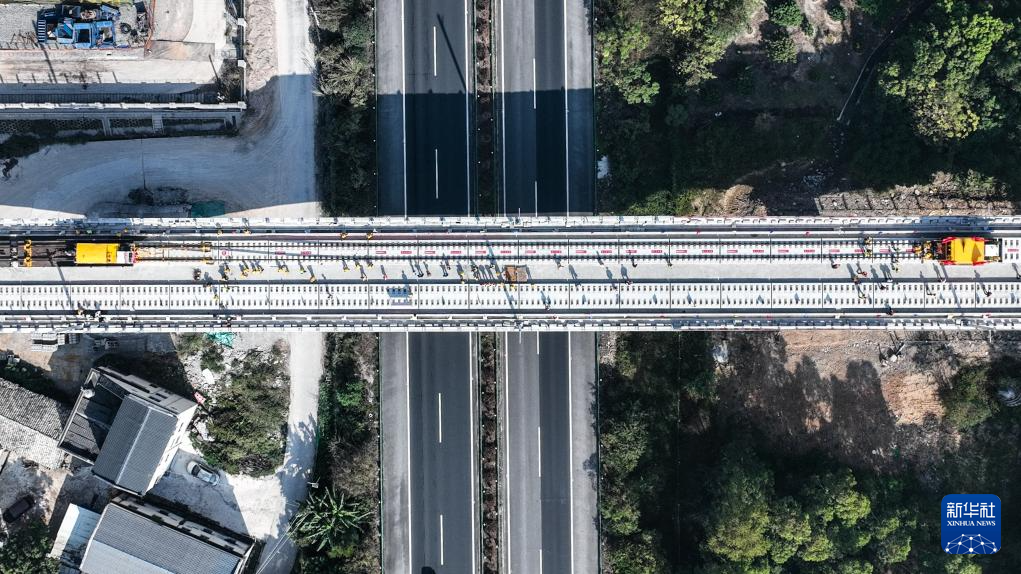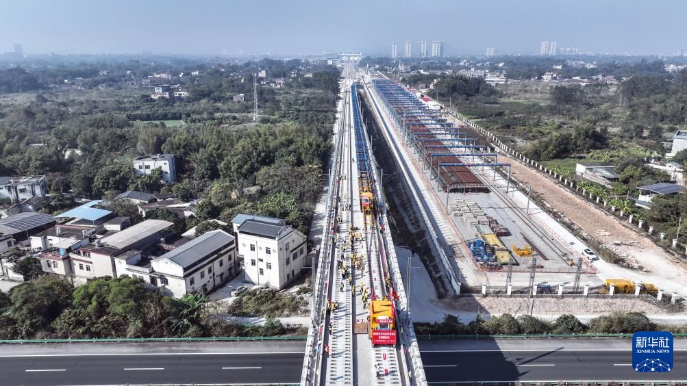 12月20日,南珠高铁玉林北至岑溪东段开始全线铺轨(无人机照片)。