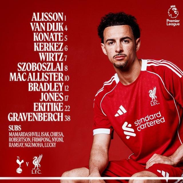 利物浦首发:1-阿利松、6-凯尔凯兹、4-范戴克、5-科纳特、12-布拉德利、38-赫拉芬贝赫、17-琼斯、7-维尔茨、10-麦卡利斯特、8-索博斯洛伊、22-埃基蒂克