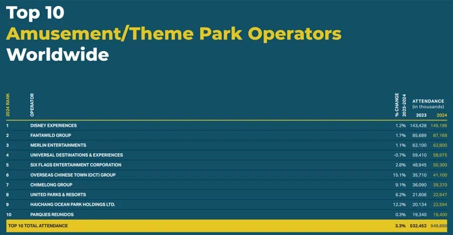 世界主题乐园权威研究机构美国主题娱乐协会(TEA)发布《2024年全球体验指数》报告(TEA GLOBAL EXPERIENCE INDEX 2024)。报告公布的全球十大主题公园运营商(Top 10 Amusement/Theme Park Operators Worldwide)名单显示,迪士尼继续高居榜首,2024年游客总量为1452万人次。2024年全球前十大主题公园集团游客总量为5.5亿人次。中国的华强方特、华侨城集团、长隆集团、海昌海洋公园等四家运营商进入十强。