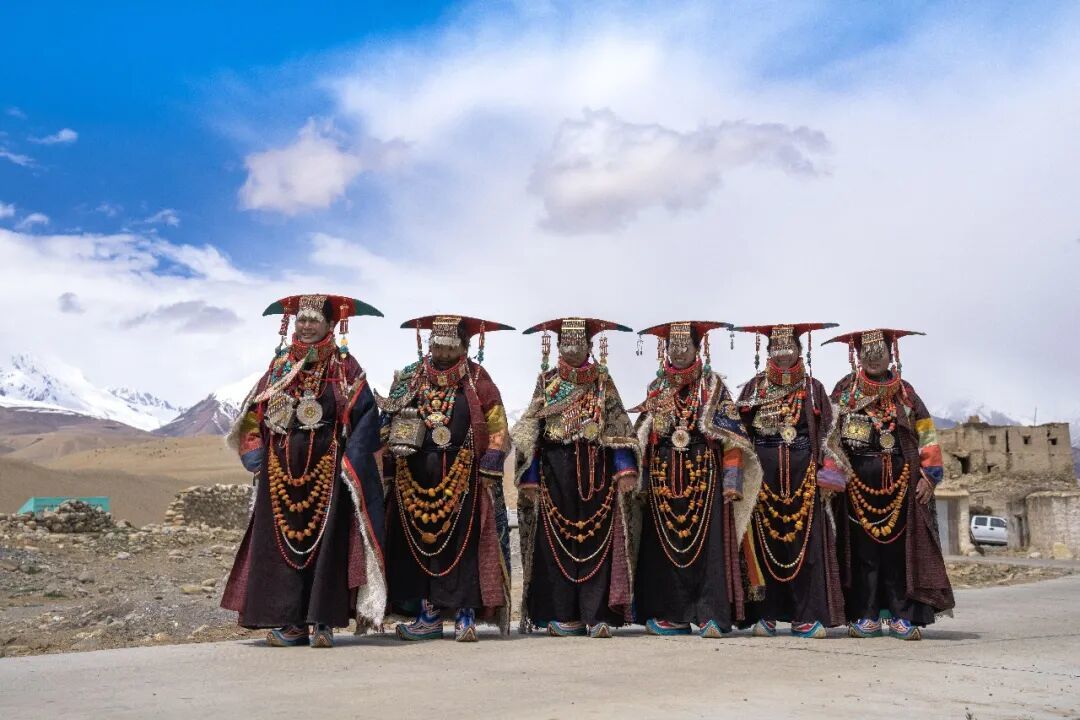 普兰妇女的“飞天服饰”极其华丽,由头饰、耳环、项链、胸饰、腰带等组成,其中最为珍贵的是传承数代人的镶满珠宝的“嘎乌”(护身盒)。