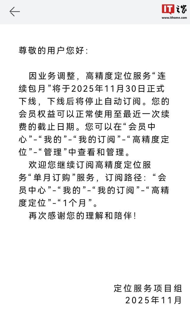 在今年 11 月,华为会员中心 App 发布公告,宣布因业务调整,高精度定位服务“连续包月”于 2025 年 11 月 30 日正式下线,下线后还将停止自动订阅。