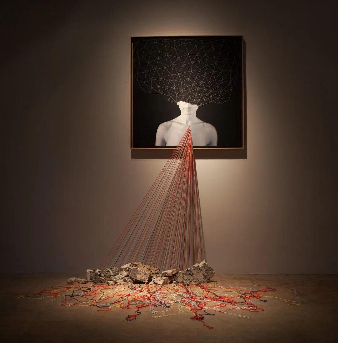 ▲ 玛丽娜•丰特,《障碍》,基于摄影的装置 ,独版作品,喷墨打印于画布、石膏、棉麻线与岩石,尺寸可变,图像:91.5cm × 91.5cm,2017, 作品图片由艺术家提供。