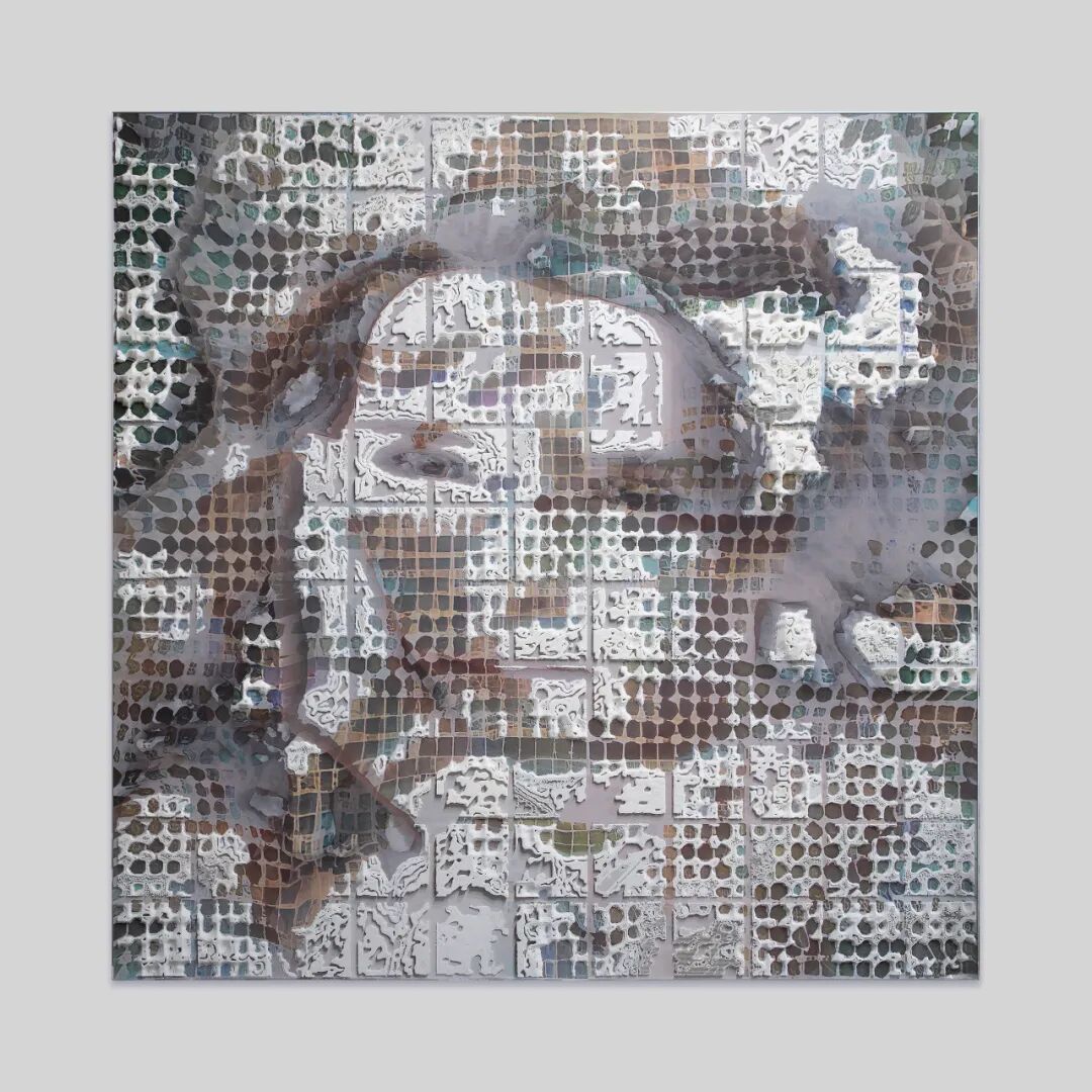其中,艺术家李汉威的作品占据着展厅的入口处,其后的绿色幕布也仿佛是在划分虚拟与现实的界限。《云上的日子》的创作源于他与3D软件、AI及图像处理技术的长期互动,他选取如苏菲·玛索海报这类大众熟知的图像,通过不断增加噪点与噪波,将图像逐渐侵蚀至不可识别。这个过程旨在将观众的注意力从图像描绘的对象中抽离,转而聚焦于其作为信息与数据的本质。