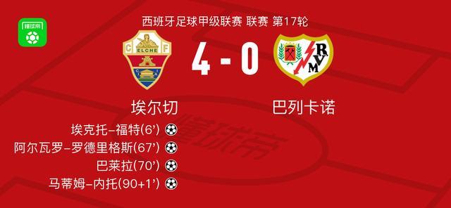 北京时间12月22日,西班牙足球甲级联赛第17轮,埃尔切主场迎战巴列卡诺。比赛伊始,阿尔瓦罗-罗德里格斯送出助攻,埃克托-福特破门得分,为主队取得领先。随后,比加斯助攻阿尔瓦罗-罗德里格斯将比分扩大。不久之后,阿尔瓦罗-罗德里格斯再次贡献助攻,巴莱拉接应破门,进一步巩固优势。下半场补时阶段,霍桑送出传球,马蒂姆-内托推射建功,锁定胜局。最终,埃尔切以4比0战胜巴列卡诺。