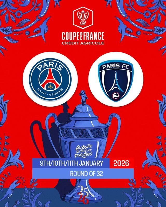 2025-26赛季法国杯32强对阵出炉,巴黎圣日耳曼将在主场对阵同城球队巴黎FC,两队将在一周内迎来法甲、法国杯连续交手。