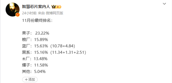 近日,有数码博主公布了11月国内手机市场销量排名。其中,小米、vivo以及OPPO三家的市场份额占比十分接近,相差不超过1%。