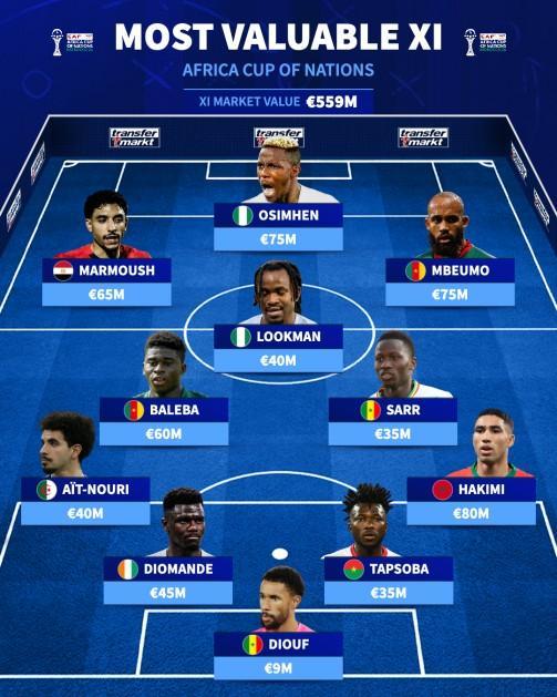 姆伯莫(喀麦隆/曼联)7500万欧元、奥斯梅恩(尼日利亚/加拉塔萨雷)7500万欧元、马尔穆什(埃及/曼城)6500万欧元
