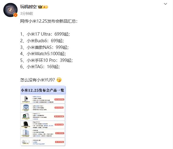 12月22日,有数码博主整理汇总了小米12月25日发布会网传将发布的新品及价格。爆料显示,此次发布会共有六款新产品。其中,小米17 Ultra的价格预计为6999元起。