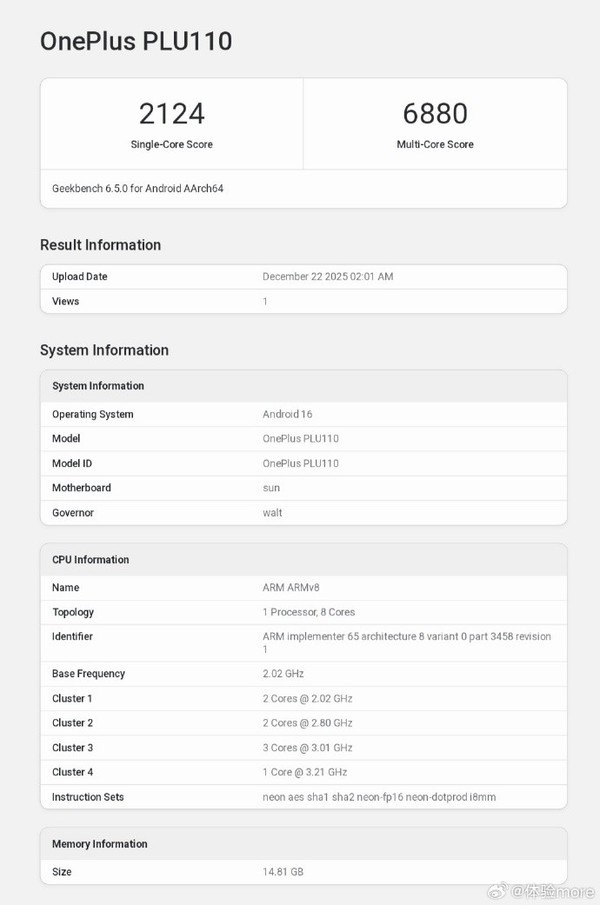 12月22日,一款型号为“OnePlus PLU110”的新机出现在Geekbench跑分平台上,从配置信息判断,该机极有可能是一加即将推出的Turbo系列新品。跑分数据显示,其单核得分2124,多核得分6880,整体性能处于安卓阵营第一梯队。