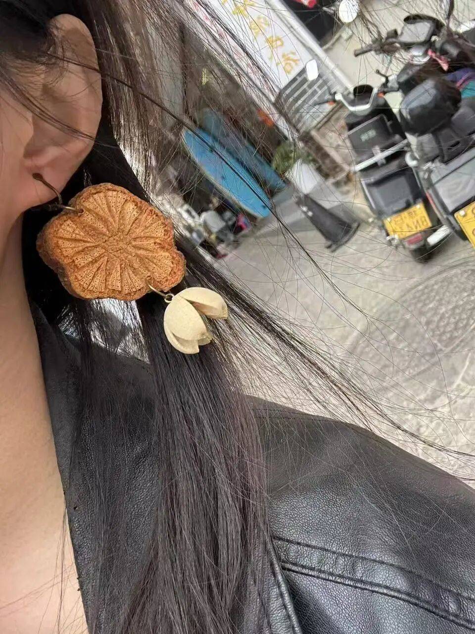 我戴着在后海村买的耳夹,穿着掉皮的皮衣