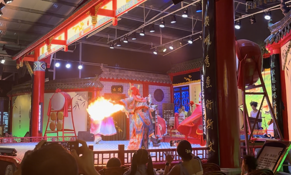 也是那段时间,我在抖音刷到成都人在水上打麻将的视频,为了避暑,他们把麻将桌搬到水上,在树荫下打麻将。回到小红书,我又看到成都人喝茶听曲儿的场景,茶馆木桌木椅,灰砖墙,店员穿着棉质长袍,高高举起长嘴壶给客人填茶,客人磕着瓜子,看台上演员张着双臂表演变脸。