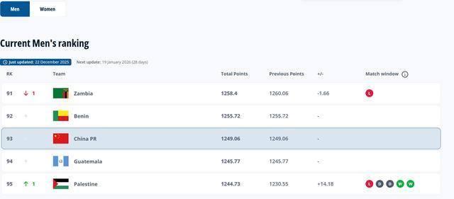 北京时间12月22日,国际足联(FIFA)公布了最新一期男足世界排名。中国男足位列第93名。这一排名也成为自2014年以来的最低年终排名。