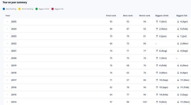 根据国际足联发布的排名,中国男足在2025年年终位列世界第93名,创下自2014年以来的最低年终排名纪录。