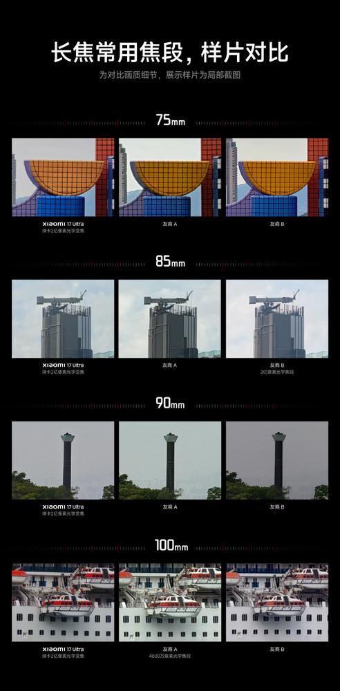 根据官方信息,这枚长焦镜头实现了75mm至100mm焦段的连续光学变焦,并且在整个变焦行程内均支持全2亿像素光学直出。这意味着用户在使用该焦段进行变焦时,无需依赖数码裁切,即可获得全程无损的高分辨率画质。卢伟冰通过社交媒体展示了用该镜头在不同常用焦段拍摄的样片与友商机型对比,邀请公众审视其成像实力。