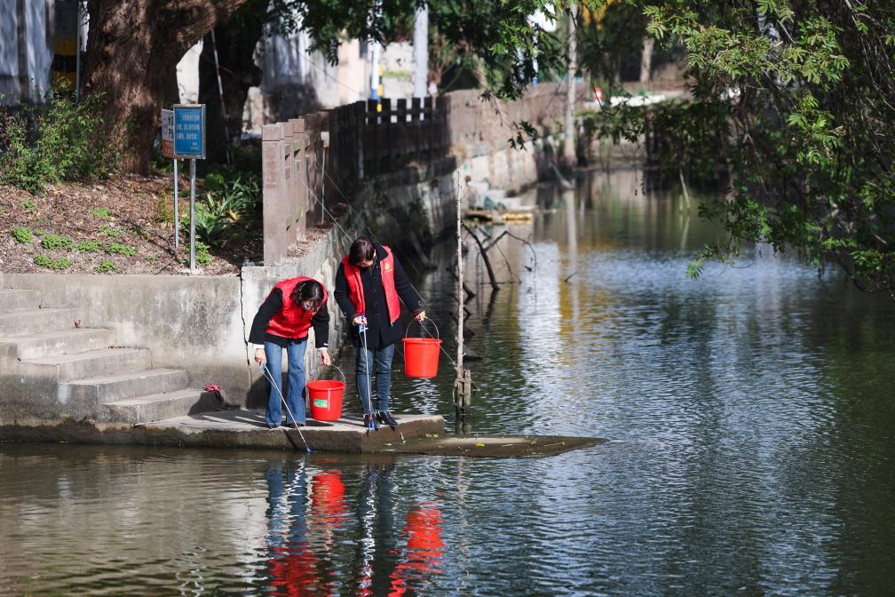 11月25日,和平镇长城村党员志愿者在河岸旁清理漂浮物。新华社记者 徐昱 摄