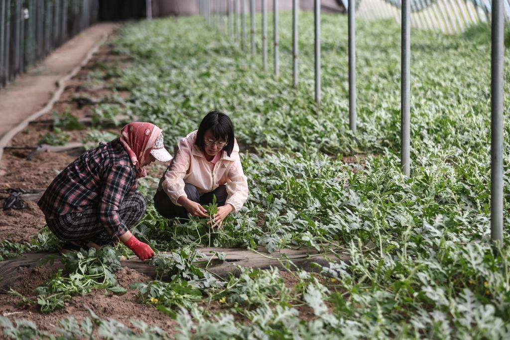 6月3日,李明明(右)与种植工人在“种养加”一体化产业园内的西瓜大棚内查看西瓜长势。新华社记者 潘昱龙 摄