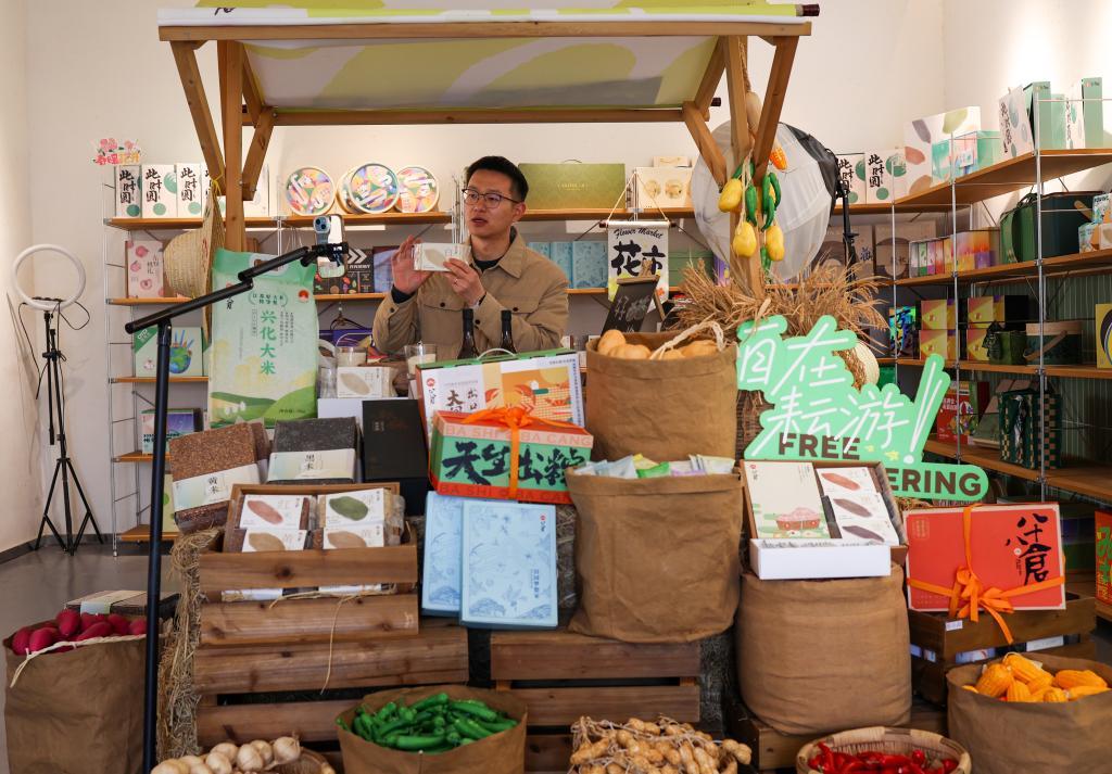 11月21日,在江苏省兴化市千垛镇东罗村,网上销售直播人员介绍当地特色农产品。新华社发(史道智摄)