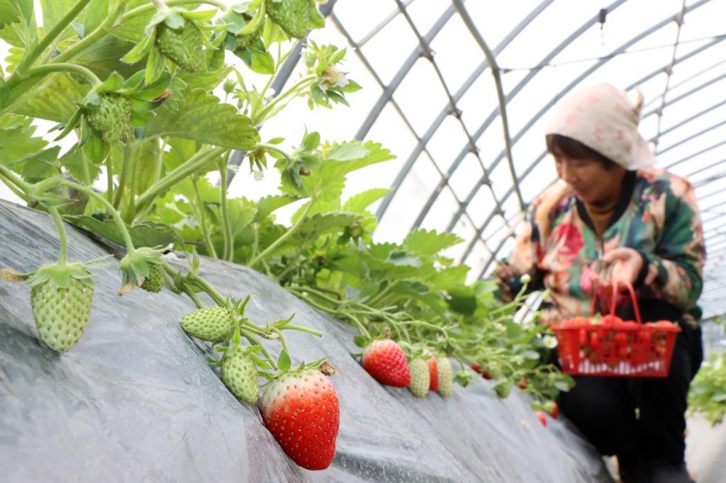 12月16日,农民在山东省滨州市博兴县湖滨镇柳童村大棚里采摘草莓。新华社发(陈彬摄)