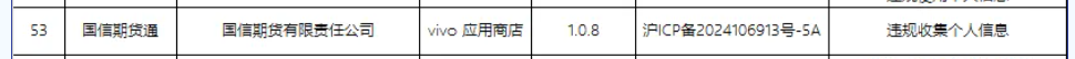 其中,ICP备案主体为国信期货有限责任公司的国信期货通(版本号1.0.8)所涉问题为违规收集个人信息。