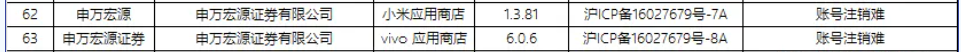 ICP备案主体为申万宏源证券有限公司的申万宏源(版本号1.3.81)、申万宏源证券(版本号6.0.6)所涉问题均为账号注销难。