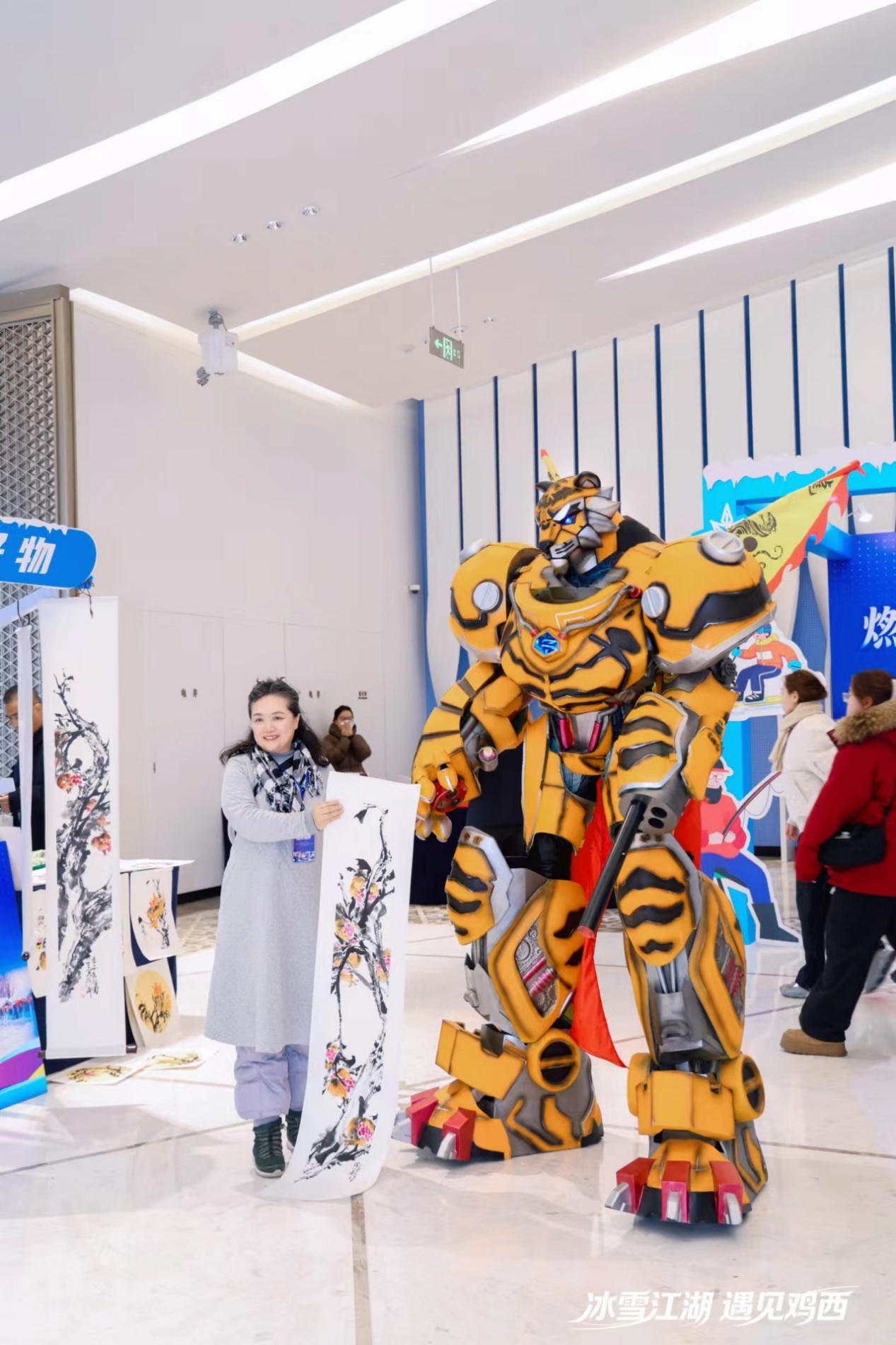 场内推介气氛热烈,场外展示同样热闹非凡。鸡西市各区县展位各具巧思,构建起集“特色展示+互动体验+打卡传播”于一体的多功能文旅空间,更有威风凛凛的老虎机甲和“吉米虎”玩偶与嘉宾互动,还有特色美食品尝,与会嘉宾在看、听、尝中沉浸式感受鸡西魅力。