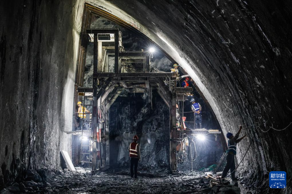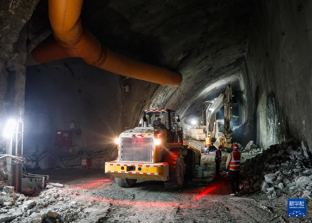 12月23日,施工人员在深圳外环田头山隧道群右线隧道和斜井隧道交汇断面开挖作业。